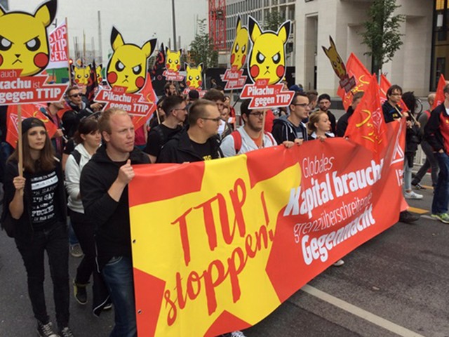 秋の気配が濃厚になった9月半ばの独フランクフルトで、数万人が大通りを埋め尽くすデモに出くわした。米国とEUによる環大西洋貿易投資協定(TTIP)などへの反対運動だった。アドバルーンや手作りの派手なのぼりがはためき、ピエロに仮装する人や、TTIPの「棺おけ」を抱えた人まで繰り出した。