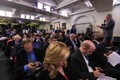 満席状態の定例会見の開始直前の様子。「2-minute warning(2分前の知らせ)」がアナウンスされると、テレビのリポーターたちはカメラに向かい話し始めるが、2分前の知らせのはずが5分、10分になることもしばしば=ランハム裕子撮影