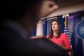 定例会見で記者からの質問に答えるサンダース報道官。2017年7月26日、34歳という若さでホワイトハウス報道官に就任した=ランハム裕子撮影