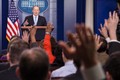 2017年2月16日、77分に及んだトランプ大統領初の単独記者会見。多くのジャーナリストが大統領に直接質問しようと競って手をあげた=ランハム裕子撮影