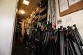 会見室の後ろにある収納スペース。フォトグラファーは三脚や脚立をここに保管している。壁に掛ける脚立の数が増加し重すぎて棚ごと落下したこともある=ランハム裕子撮影
