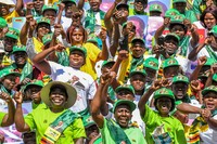 結局、現職候補のムナンガグワ大統領(75)が現れたのは4時間後。自らの写真が入ったカラフルな服を着て登場すると、支持者からの歓声や拍手に加えて、伝統楽器のブブゼラも鳴り響きました。
