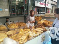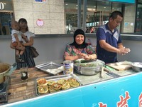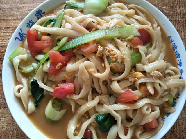 料金交渉は言い値で「一日400元(約6400円)」。地元の物価では安くないのだろうが、寒くて値切る気力がない。タクシーに乗り込むと、雨はしだいにあがってきた。帰りの列車まで7時間もある。ほっとしたらおなかがすいた。運転手に頼んで、牛肉麺を食べに行く。日本でも最近、はやっている牛肉麺の本場、蘭州は青海省の隣。西域が本場の食べ物だ。手打ちの風景がガラス越しに見える。大好きな香菜はのせほうだい。9元(約140円)。麺は細めだ。運転手のまねをして黒酢をかけて食べたらとてもおいしかった。