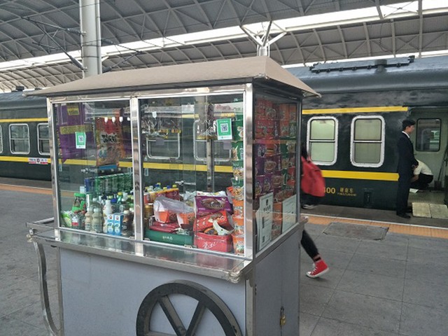 さあ、出発だ。「原子城」へ向かうY981は午前7時に発車する。午前6時にホテルを出るとまだ薄暗い。西寧と北京の経度は15度も違う。札幌と那覇ほどに差がある。夜が明け始めた6時半すぎ、改札が始まった。ホームには6両編成の「緑皮車」が待っていた。緑に黄色の横線が入った車両で、在来線でよくみかける。駅員さんは「中国を代表する伝統的な車両です」と誇らしげに説明してくれた。