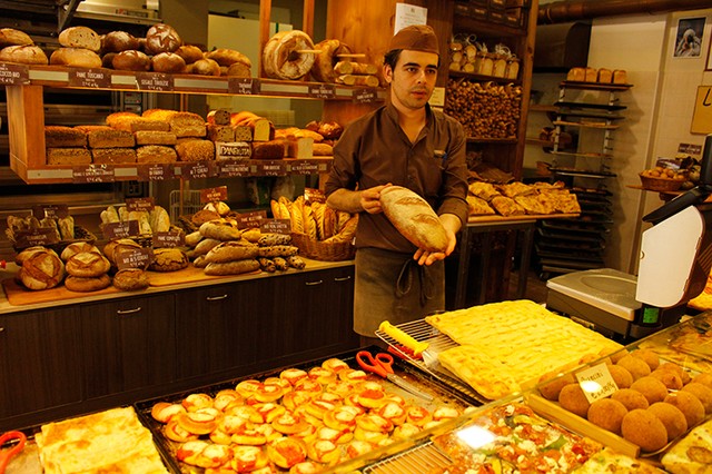 訪れたパン屋「ペリーノ・ヴェスコ」の店舗に入ってすぐ、自分の不明を恥じた。グリッシーニが積み上げられているが、これは自分が今まで見てきたグリッシーニではない。あのストローのような細いものではなく、ドラムのスティック(ばち)ぐらいの太さがあり、長さも50㌢ぐらいで存在感がある。しかも店員に聞くと、グリッシーニと似た「ルバタ」という棒状のパンのほか、グリッシーニにもオリーブオイル入りとオイルなし、と細かく分かれているという。