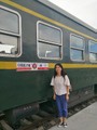 緑に黄色のラインが入った「緑皮車」と呼ばれる車両と筆者=2018年8月11日、青海省海北チベット族自治州で。
