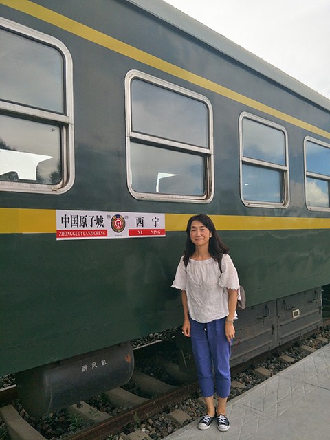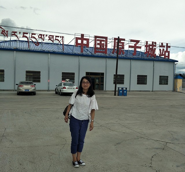 中国原子城駅で筆者=2018年8月11日