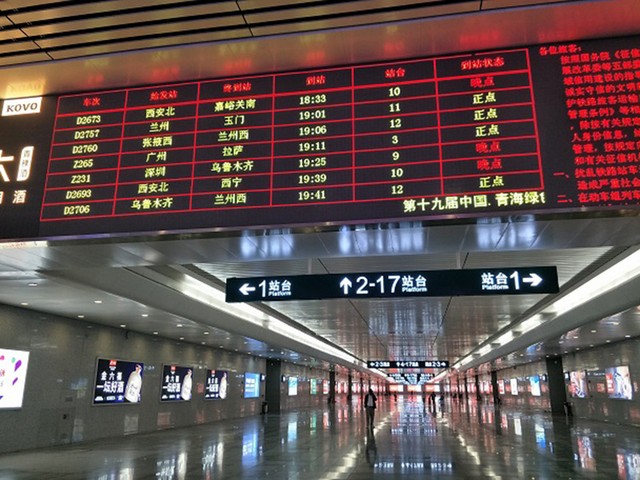 西寧駅の構内。ここに停車する列車の案内板には、始発と終点となる駅名が書かれている。新疆ウイグル自治区ウルムチ、甘粛省蘭州、陝西省西安など西域の地名が目立つ。正点は定刻、晩点は遅れを示す=2018年8月11日、西寧駅、吉岡桂子撮影