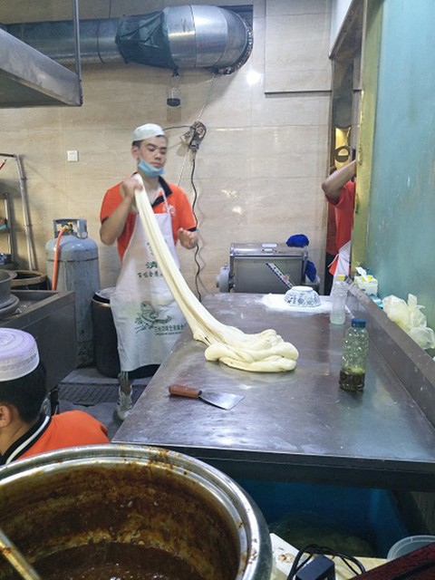 麺を手打ちする様子=2018年8月11日、青海省海北チベット族自治州西海鎮、吉岡桂子撮影