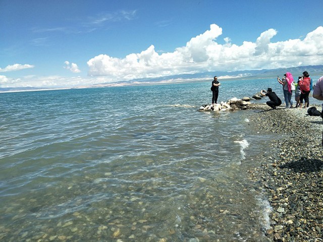 中国最大の塩水湖、青海湖。周辺はサイクリングしたりドライブしたりする旅行客でにぎわっていた=2018年8月11日、青海省青海湖、吉岡桂子撮影