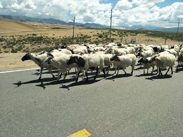 道路を走るヒツジをしばしば見かけた=2018年8月11日、青海省海北チベット族自治州西海鎮、吉岡桂子撮影