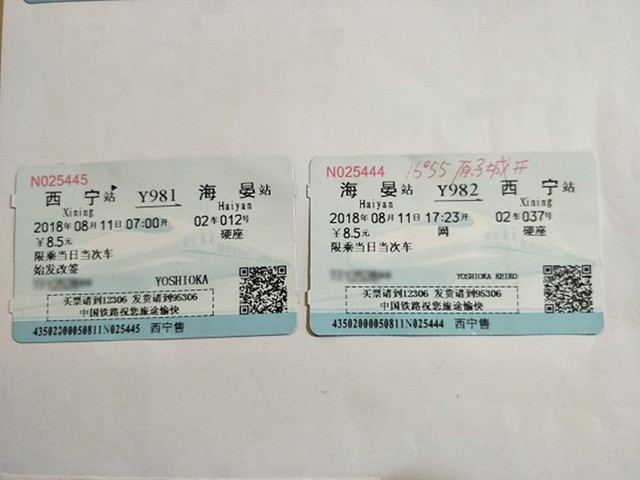 西寧駅と中国原子城駅を結ぶ観光列車の切符。新しく作られた中国原子城駅は、システムが対応していないのか、切符に名前がない。一つ手前の海晏駅が記されている。(画像の一部に加工をしてあります)