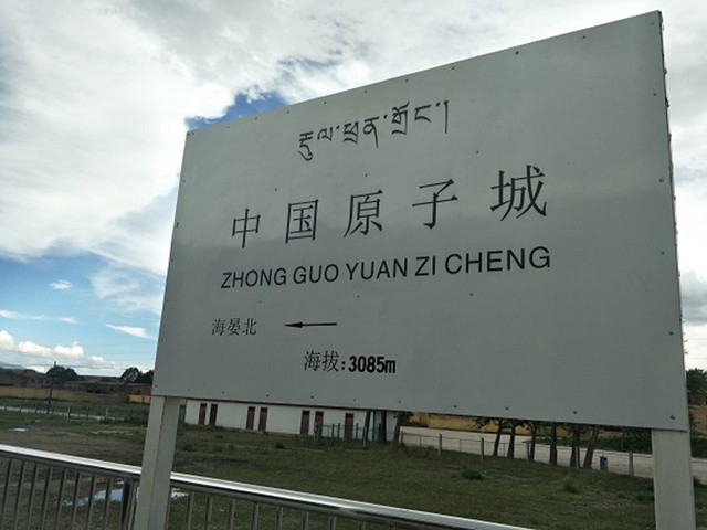 今夏の観光列車の運行にあわせて作られた中国原子城駅の看板。海抜3085㍍。蔵文と呼ばれるチベット語表記もある=2018年8月11日、青海省海北チベット族自治州、吉岡桂子撮影