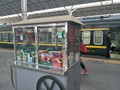 中国の在来線のホームには、食べ物や雑貨を売るスタンドがある場合もある。残念ながら、早朝だったので開いていなかった。カップ麺やお菓子、お茶などにまじって、安くて小さい白酒もあった=2018年8月11日、青海省西寧駅、吉岡桂子