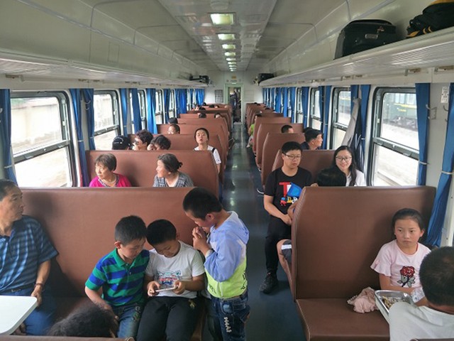 西寧駅と中国原子城駅を結ぶ列車の車内=2018年8月11日、吉岡桂子撮影