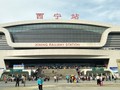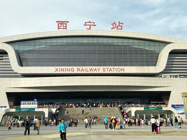 巨大な西寧駅。チベット・ラサと結ぶ「青蔵鉄道」の起点でもある=2018年8月10日、西寧駅、吉岡桂子撮影