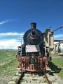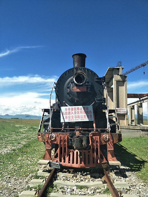 爆弾などを核実験が行われた新疆ウイグル駅まで運んだ列車を牽引したという機関車=2018年8月11日、青海省海北チベット族自治州西海鎮「上星駅跡」、吉岡桂子撮影