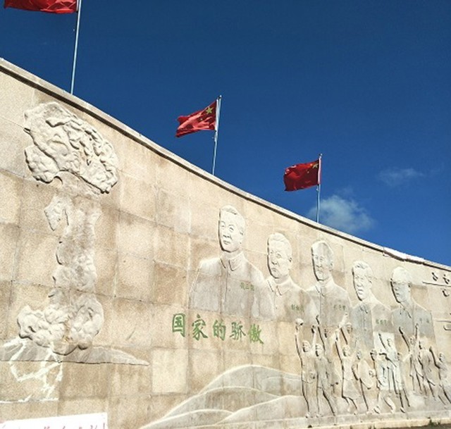 原爆の開発に貢献した科学者十人をたたえる碑。きのこ雲も彫られている=2018年8月11日、青海省海北チベット族自治州西海鎮「爆発試験場」、吉岡桂子撮影