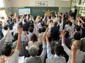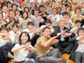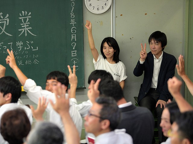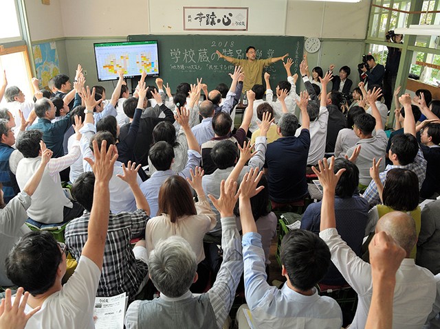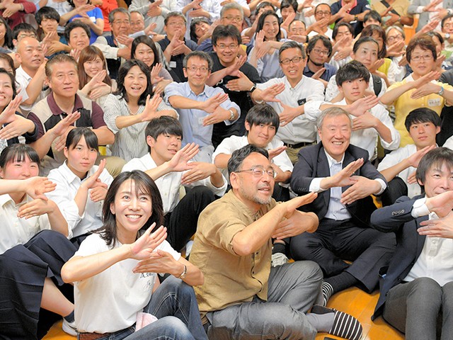 【写真】活気にあふれる佐渡島「学校蔵」の授業 Breakthrough 突破する力 更新日:2018.09.25 公開日:2018.09.04 特別授業の最後、参加者らと手で佐渡島の形を表現する尾畑(左下)と健(右下)=惠原弘太郎撮影