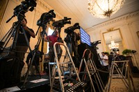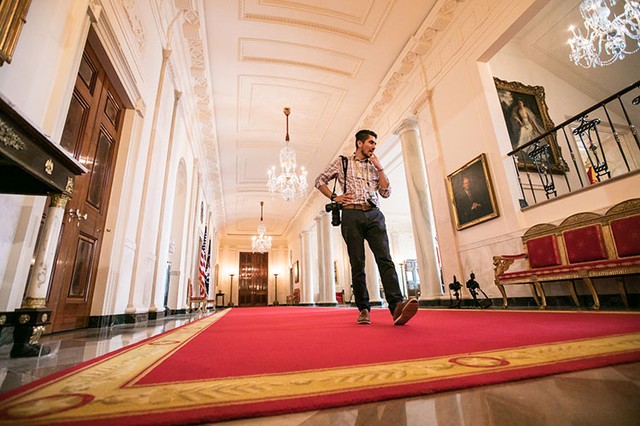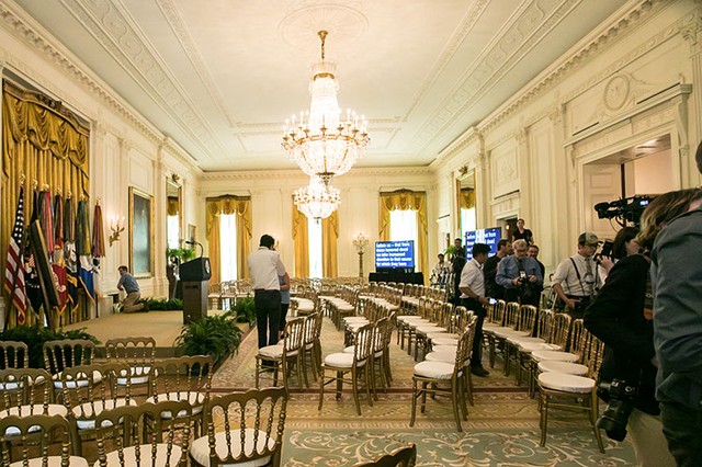イーストルームで撮影する際に重要なのは、どんな「演出」でイベントが行われるかを知っておくこと。どこに演壇があるか、どこから大統領が入退場するか、どれくらい撮影スペースがあるか、どのような照明かといった詳細だ。とはいえ、イベントにより異なるため、それは開けてみてのお楽しみ。「本番」の数時間前にあるプリセットで初めてドアが開き、会場の詳細を把握することができる。