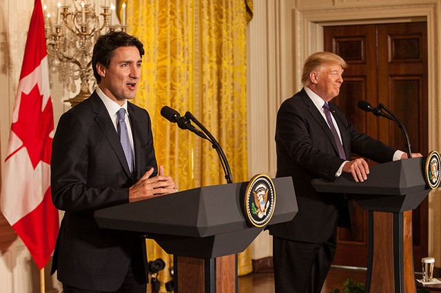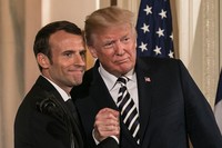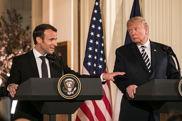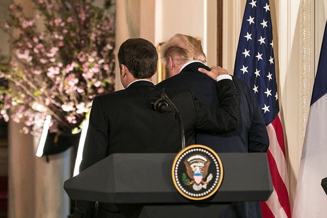 今年4月、フランスのマクロン大統領がホワイトハウスを訪問し共同会見が行われた時のこと。それぞれマイクが取り付けられた2つの演壇は通常よりも非常に近い距離に並べられた。その近さは一目瞭然だった。すぐに手が届く距離だったせいか、何度も交わされた固い握手に加え、ハグもして見せた。最後には、トランプ大統領とマクロン大統領が顔を近づけてカメラにポーズしたため、「仲良し画像」をゲットすることができた。その仲良しレベルはさながら女子高生の自撮りツーショット。今までも各国首脳と大統領の握手シーンを写真に収めてきたが、こんなに顔が近づいたのは初めて。マクロン大統領の手を握るトランプ大統領の手に、ぎゅっと力が込められているのも見える。会見後はマクロン大統領がトランプ大統領の肩に手を回し、二人はラブラブのまま赤絨毯の上を退場した。