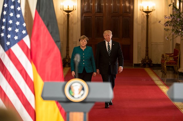 対照的に、その約1ヶ月後にホワイトハウスを訪れたドイツのメルケル首相との共同会見では、2つの演壇の距離は遠くなっていた。去年の春にホワイトハウスを訪問した時の演壇の距離はもっと近かったのに(マクロン大統領ほどではないが)。ただ、その時のメルケル首相の表情は固かった。こちらへ向かって赤絨毯を歩いた際、話しかけるトランプ大統領に反応することなく、前だけを見て進む姿が印象的だった。本番で、本人らがどのようなパフォーマンスを繰り広げるかは別としても、演出の細かいところの一つひとつに意図があるものだ、とよくいわれる。