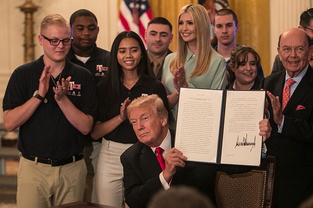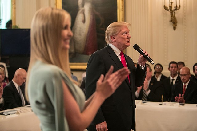 トランプ政権になってから、演出は多様化している。先月イーストルームで行われた労働者とのイベントでは、演説の後、コの字型に並べられた長机に沿って、トランプ大統領と娘のイバンカがマイクを持って会場内を歩き、労働者やCEOと握手をしながら紹介して回るというものだった。トランプ大統領は司会者役。その横には美人アナウンサー、イバンカ。まるでテレビ番組を見ているようだった。