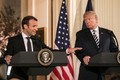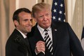 2018年4月にホワイトハウスを訪れたフランスのマクロン大統領とトランプ大統領が共同会見で最後にカメラに向かってポーズし、「ブロマンス」をアピールした=ワシントン、ランハム裕子撮影