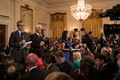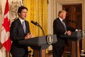 2017年2月にカナダのトルドー首相がホワイトハウスを訪れた時の共同記者会見。会場を縦長に使い、一番奥に演台を置く「ホットドッグ」型=ワシントン、ランハム裕子撮影