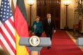 2017年3月、ドイツのメルケル首相がホワイトハウスを訪問した際、トランプ大統領と一緒に廊下を歩き、共同会見の演壇に上がった。メルケル首相の表情は終始こわばっていたのが印象的だった=ワシントン、ランハム裕子撮影