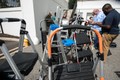 イーストルームでイベントが行われる際、まずはプリセットに入るために自分の脚立や三脚を外に並べなければならない。基本的には到着順のはずだが、いつもこのように列が乱れる=ワシントン、ランハム裕子撮影