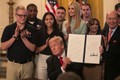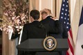 大統領令の署名式で、サインをするたびにそれをカメラに見せポーズをするトランプ大統領。署名に使ったペンは毎回誰かにあげるのが儀式になっている。この日は一番左側の青年がペンをもらった=ワシントン、ランハム裕子撮影