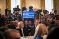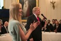 2018年7月、労働者評議会を設立させる大統領令の署名式典が、企業幹部や労働者を迎えイーストルームで行われた。マイクを持ったトランプ大統領が、娘のイバンカと共に挨拶して回った=ワシントン、ランハム裕子撮影