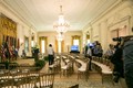 イーストルームでのプリセット。およそ10分という限られた時間内で、場所取りと、カメラ、音声などの設定をする。プリセット後の会場は「本番」まで立ち入り禁止となる=ワシントン、ランハム裕子撮影
