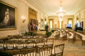 プリセット完了後のイーストルーム。配置は「ハンバーグ」型。ドアとは反対側に演壇が準備されたが、後方から入場する大統領に対し、出席者は振り返り拍手をしながら迎えた=ワシントン、ランハム裕子撮影