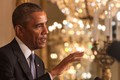 鏡に映るシャンデリアをぼかして撮ったオバマ大統領。2015年1月、キャメロン前英首相との共同会見=ワシントン、ランハム裕子撮影
