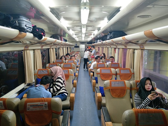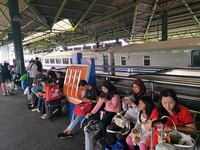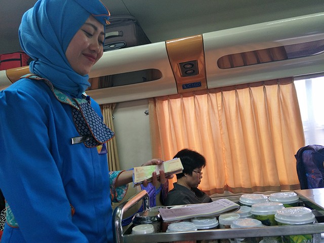 片道3時間あまり。150000ルピア(約1200円)ぐらいだった。往復とも、それなりに乗客の姿があった。標高700メートルの高原にあるバンドンは熱帯にしては過ごしやすい。大学都市でもある。学生らしき若い乗客も多かった。この旅で記憶に残るのは列車そのものではない。ヒジャブで頭を覆ったイスラム教徒の若い女性が、手鏡を持ってマスカラを熱心に塗っていたことだ。片目に何十回も。日本で論争の種になる女子高校生のしぐさを思い出した。興味津々で後ろの席からのぞいている私も、ひょっとしたら手鏡に写っていたかもしれない。車内販売で鶏肉やお芋の団子のようなもの、炒めたタマネギや落花生などを白いごはんにのせてあるお弁当「NASI RAMES」を買った。30000ルピア(約240円)。スパイシーで、ちょこっと甘く、おいしかった。