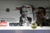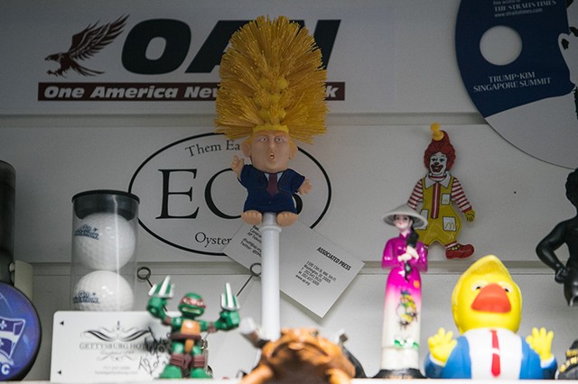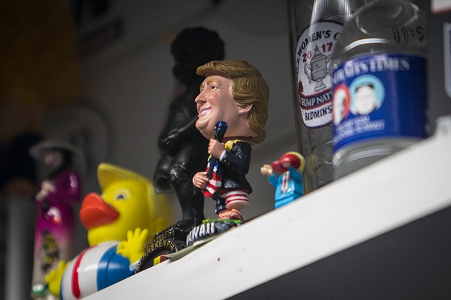 この棚は演壇と逆方向に向いているため、後方からでないと見えない。オバマ前大統領が表紙を飾った雑誌も含め、圧倒的にオバマグッズが多いが、水に浮かべるトランプダック(アヒルのおもちゃ)の新入りも最近加わった。トランプ大統領のグッズは、金髪の頭がブラシになっているものや、面白い表情のトランプ人形など、笑えるものが多い。