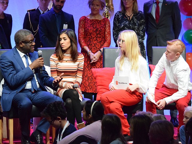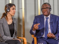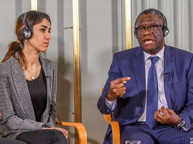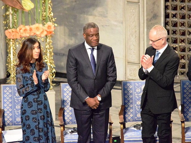 コンゴ東部のブカブの病院で約20年にわたり、5万人以上の性暴力被害者の支援にあたってきたムクウェゲさん。授賞式には、過激派組織「イスラム国」(IS)の性暴力の実態を告発し、平和賞の受賞が決まったヤジディ教徒、ナディア・ムラドさん(25)の後から入場してきました。