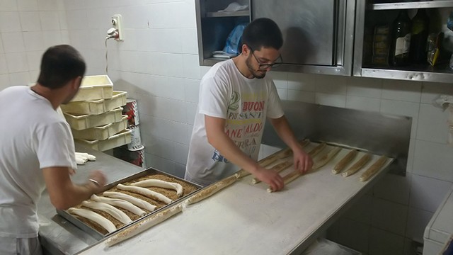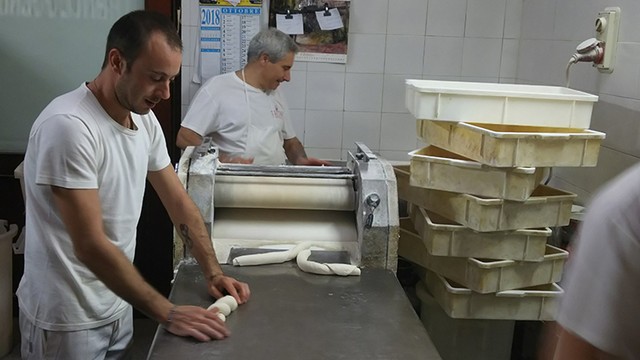 目指すパン屋「ペルナ」は、パレルモ中央駅からすぐの旧市街に店を構えていた。20平方㍍ほどの狭い店内の奥に、オーブンと作業場がある。店に入るとあいさつも早々に「早く見に来い」と作業場の中の職人たちから手招きと声がかかる。