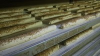 ②ごまを敷き詰めたバットの上で転がしてまんべんなくごまをまぶした後、寝かせてから約230度のオーブンで焼く。