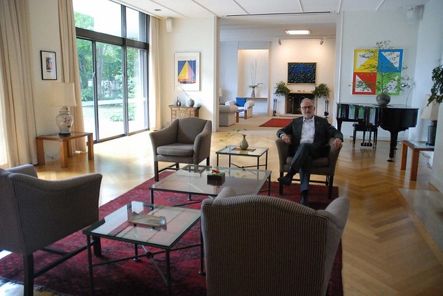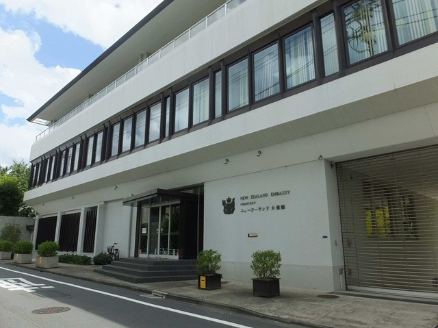 <ニュージーランド大使館> 所在地は渋谷区神山町。大使館のほかに、大使公邸や職員住宅などが並ぶ。敷地内には日本庭園があり、池で泳ぐニシキゴイや石灯籠(どうろう)が来客の目を楽しませる。石の仏像まで安置されているが、由来は「よく分からない」とペイトン大使。