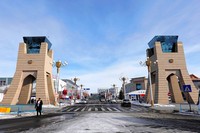 出国手続きをして国境に近づくと、雪原の先に近代的なビル群が現れた。中国とカザフ両側からビザなしで30日間まで滞在できる経済特区になっており、国境線上をそのまま歩いて行き来できる。