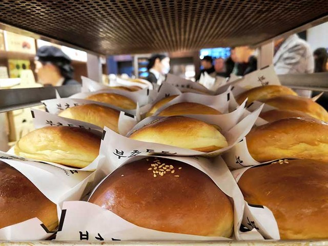 そろそろソウルへ向かう時間だ。大田駅には地元の名物パン屋「聖心堂」が店を出している。ニラ玉パンとメロンパンにあんこを入れて揚げたそぼろパンで知られる。どちらも日本円で200円弱。いつも行列ができているそうだ。韓国三大パン屋の一つらしい。
