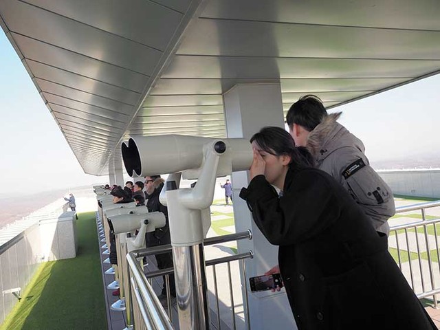 韓国軍の部隊や残る地雷、ふつうの田んぼ、野菜のビニールハウス――。さまざまに入り交じる地域をバスはめぐる。最初に訪ねた平和公園には、昨春の首脳会談で向き合う韓国の文在寅(ムン・ジェイン)大統領と北朝鮮の金正恩(キム・ジョンウン)朝鮮労働委員長の笑顔のパネルがずらりと並んでいた。展望台では韓国の人たちが食い入るように望遠鏡をのぞいている。両国の旗が高さを競いあうようにはためき、経済制裁の意味から操業停止となっている北側の開城(ケソン)工業団地もくっきりと見える。