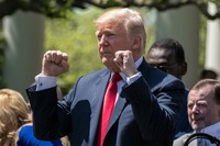 この日、演壇で拍手をしながらトランプ大統領を晴れ舞台に迎えたのは、ムニューシン財務長官、ライトハイザー通商代表部代表、クシュナー大統領上級顧問を始めとする27人もの閣僚や高官だった。真剣な面持ちで登場し、マイクに辿り着くといつものにんまり笑顔。何度もアドリブを入れながら、前半は準備されたスピーチを読み上げた。