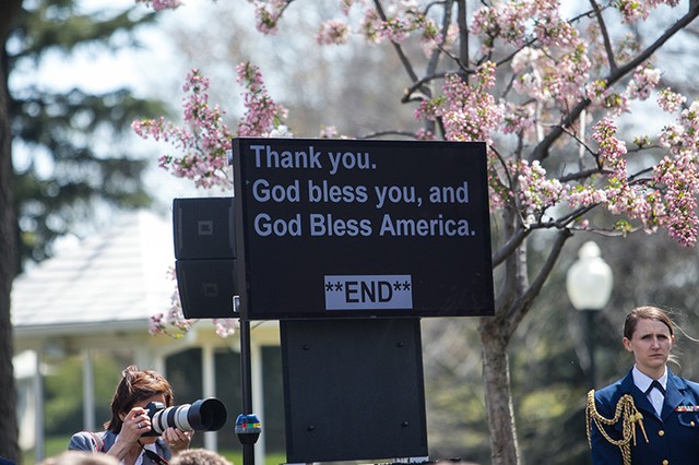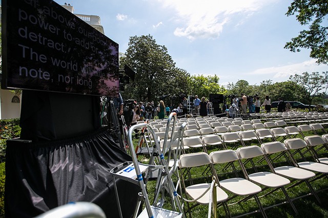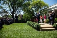 「レディース・アンド・ジェントルマン!アメリカ合衆国の大統領の登場です!」いつもの大げさなアナウンスと同時に、ローズガーデンに面した執務室のドアがゆっくりと開く。拍手喝采の中、大統領が演壇まで歩く。これも演出の一つだ。トランプ氏はおよそ20歩で演壇に着くが、途中で立ち止まり、手を振ったりガッツポーズを見せたりすることもしばしば。だが登場時はなぜか目を細め、無表情または若干不機嫌に見えることが多い。