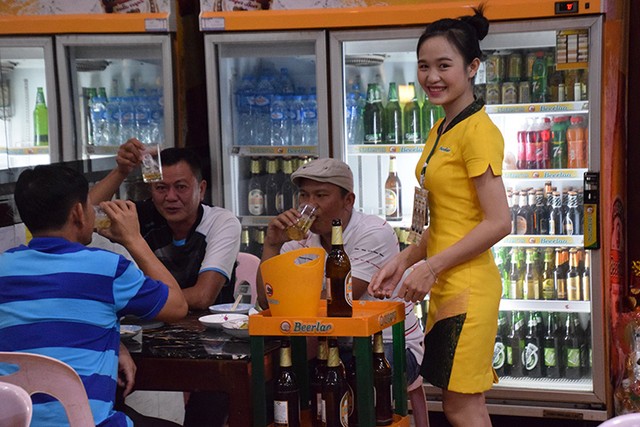 店に常駐するビアラオ販売促進ガールのトウキターさん(21)は、北部のサムヌア出身。ビアラオのシンボルカラーの黄色のユニフォームを着てテーブルを忙しく回り、笑顔を振りまきながら客のグラスにビールを注ぐ。首からは新しく売り出し中の3種類(ホワイト、ホッピィ、アンバー)の写真入り広告用プラカードを下げている。