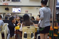 4人が座れるテーブルが10卓ほど。この通りは、同じような店が大小3軒並ぶ「ビアラオ通り」で、夕方5時になるとビアラオを飲みに人々が集まってくる。平日は男性が友人や職場の仲間と連れ立ってやってくるが、週末は家族連れや女性も目立つ。赤ん坊を抱きながらテ―プルに座っている若い母親もいる。