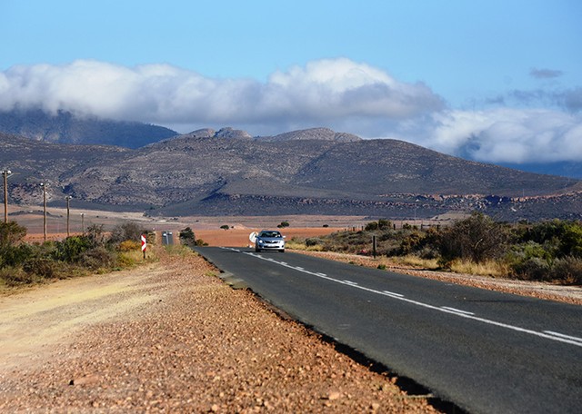 海沿いの街ジョージからオーツホーンに向かう峠道=3月30日、石原孝撮影